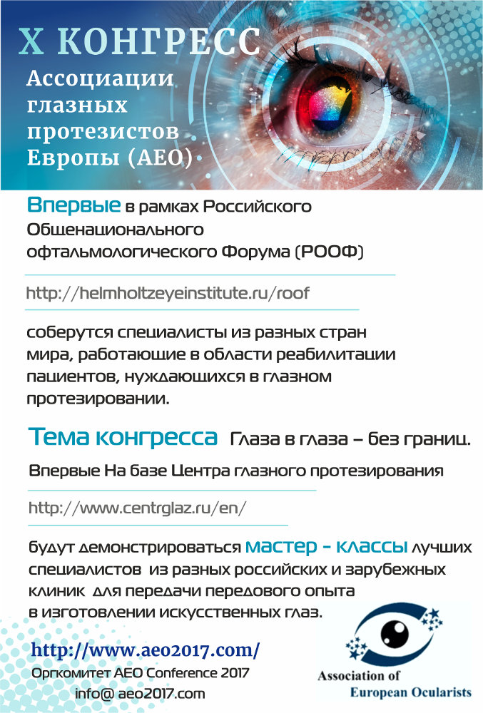 2-3 октября 2017 г. в рамках X Российского общенационального офтальмологического форума http://helmholtzeyeinstitute.ru/roof проводится X конгресс Ассоциации глазных протезистов Европы (АЕО) Глаза в глаза – без границ.