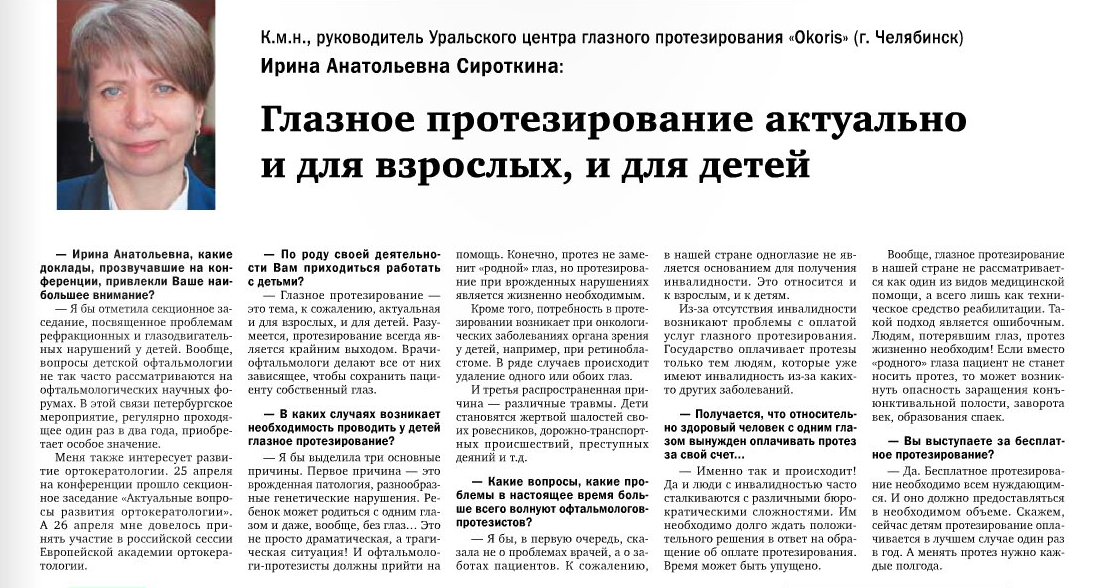 Интервью с Ириной Анатольевной Сироткиной, к.м.н., руководителя Уральского центра глазного протезирования "Okoris" (г. Челябинск) после конференции в Санкт-Петербурге "Невские горизонты" 27-30 апреля 2014 года.