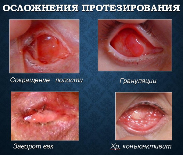 Пористый протез натирает слизистую, появляется больше слизи, чтобы протез хорошо промаргивался, получается замкнутый круг. Чем более изношен протез, тем больше слизи появляется, тем больше микробов в ней растет и размножается. Пациент может этого не замечать, просто вытирая слизь и слезу с протеза. И однажды приходит к протезисту уже с заворотом ресниц и маленькой полостью, кистами и грануляцими. С этим не всегда удается справится. Косметический результат получается гораздо хуже, чем при первичном протезировании.