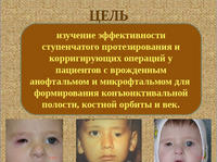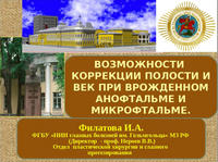 В рамках межрегиональной научно-практической конференции «Реконструктивная и эстетическая хирургия в офтальмологи - две грани одной проблемы», что состоялась 27-28 марта 2015 года в городе Челябинске Филатова Ирина Анатольевна, д.м.н., руководитель отдела пластической хирургии и глазного протезирования ФГУ «МНИИ глазных болезней им. Гельмгольца» (г. Москва) предоставила слушателям доклад «Возможности коррекции полости и век при врожденном анофтальме и микрофтальме».