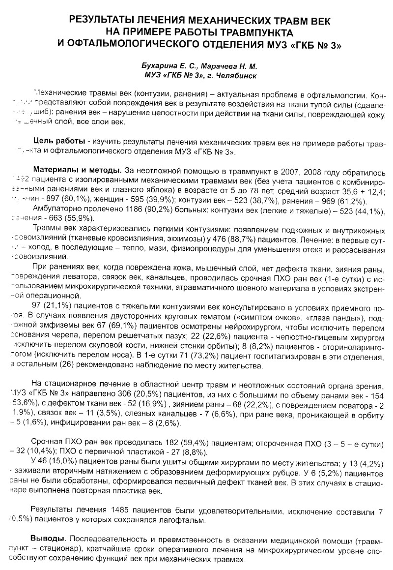 Результаты лечения механических травм век на примере работы травмпункта и офтальмологического отделения МУЗ «ГКБ № 3»/ Е. С. Бухарина, Марачева Н. М. // Материалы V Евро – Азиатской конференции по офтальмохирургии. – Екатеринбург, 2009. – С. 275.